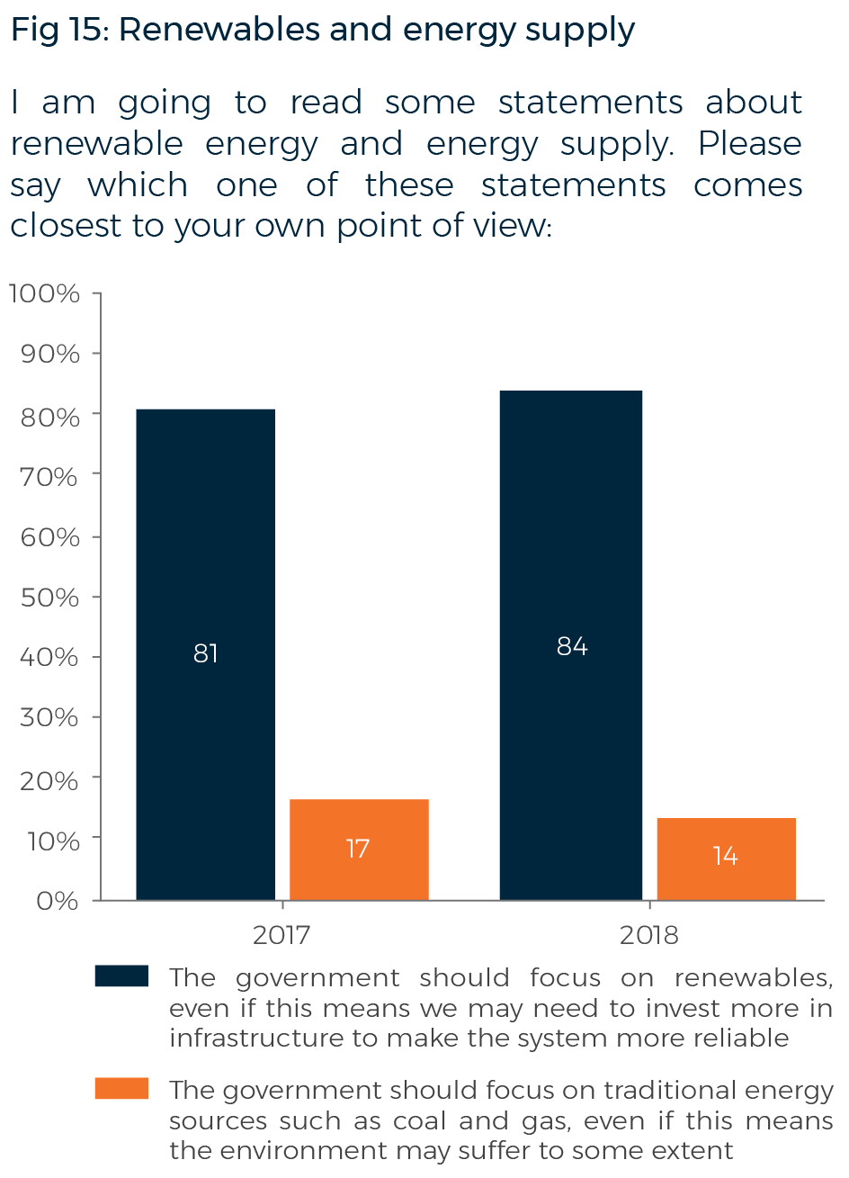 Despite the debate and political rhetoric, most Australians have not been persuaded to support coal over renewables for the nation’s energy security. Almost all Australians remain in favour of renewables, rather than coal, as an energy source. In 2018, 84% (up three points since 2017) say ‘the government should focus on renewables, even if this means we may need to invest more in infrastructure to make the system more reliable’.