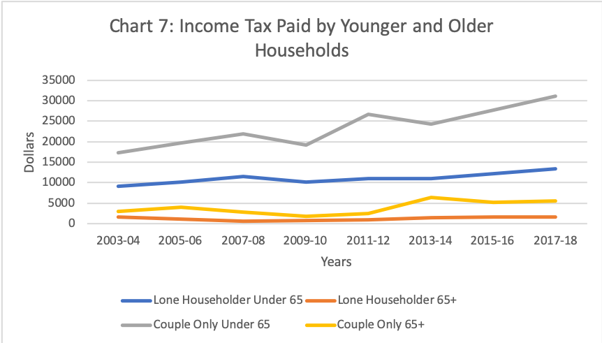 There has been a slight narrowing of the private consumption gap between older and younger households. This may reflect the rising participation rates of older Australians. However, this is not showing up strongly in terms of the gap between income taxes paid by older and younger Australians. That gap has been widening (see Chart 7).