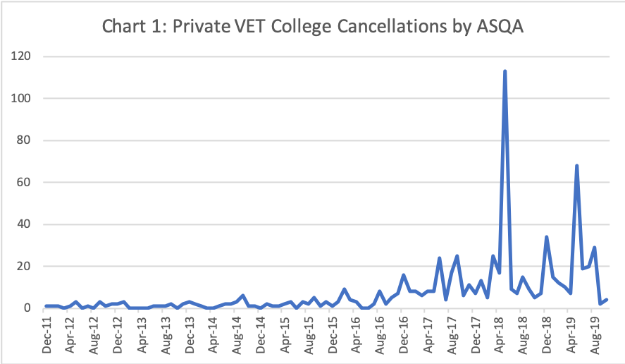 Chart 1 indicates the number of private VET college cancellations since December 2011.