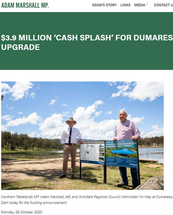 - More than $3.8 million to upgrade recreation and commercial infrastructure at the Dumaresq Dam. The local paper the Armidale Express also reported the grant win that same day – October 26.