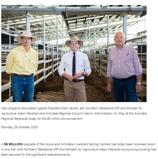 - $5 million for a rebuilding and refurbishment at the Livestock selling centres in Armidale and Guyra.