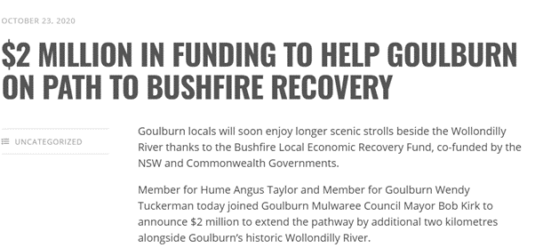 Ten days before the official announcement, federal Liberal Party minister Angus Taylor and his NSW Liberal state colleague Wendy Tuckerman announced on October 23 that their electorate of Goulburn had won a $2 million grant to extend the walking track alongside the Wollondilly River.