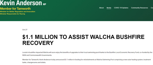 On October 15, 18 days before the official announcement, Nationals MP Stephen Bromhead gave his electorate a heads-up that they would soon be sharing in some of the spoils of the bushfire recovery money, stating in a media release: