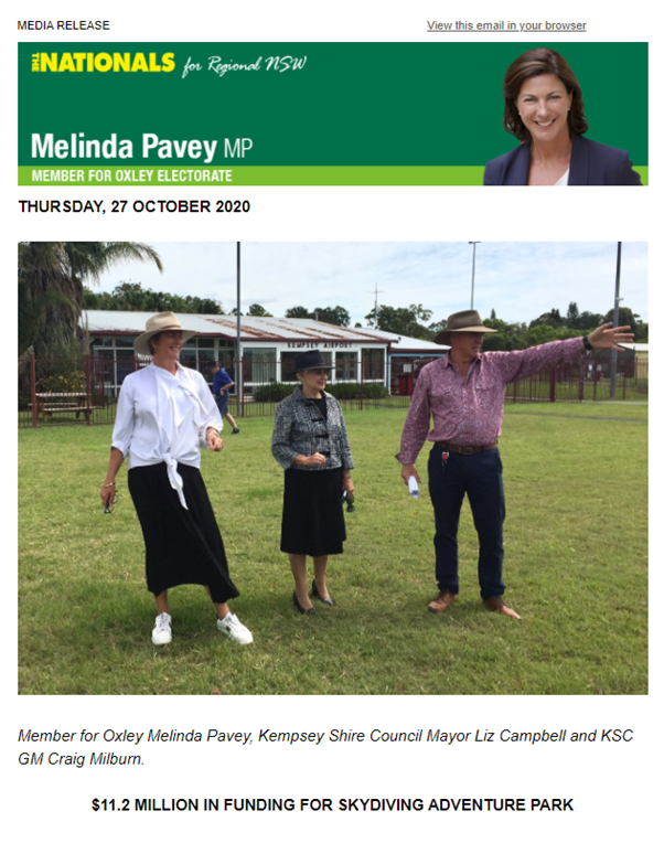 Six days before the official announcement, NSW Nationals MP Melinda Pavey announced a grant of more than $11 million for a Skydiving Adventure Park in the Macleay Valley in her electorate of Oxley.
