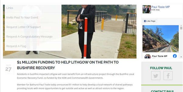That same day (October 27), Nationals MP Paul Toole, the NSW Lands and Racing Minister, and member for Bathurst announced a $1 million BLER grant for a Farmers Creek project in Lithgow.
