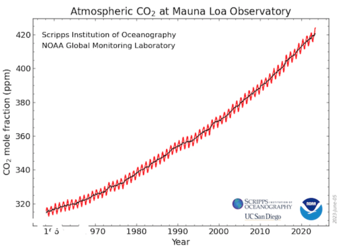 The Scripps Institution of Oceanography at the University of California San Diego partnered with NOAA, taking its own measurements at Mauna Loa, and found virtually the same concentrations of CO2 and the same huge leap since last year this time.