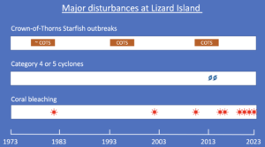 Like all ecosystems, given time the GBR can usually bounce back from the occasional disruption but when multiple disruptions occur in rapid succession the consequences can be permanent. The figure below, courtesy of Dr Hoggett, shows the disruptions experienced by the Reef at Lizard Island between 1973 and 2023. The Reef has suffered marine heatwaves and coral bleaching in four years since 2017 but the water cooled just in time to prevent coral death.
