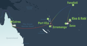 The journey to Vanuatu is the first stage of a longer voyage across the Pacific by the Rainbow Warrior to demonstrate support for climate action by Pacific island states, strengthen relationships, collaborate with communities, and amplify the visions of climate justice activists.