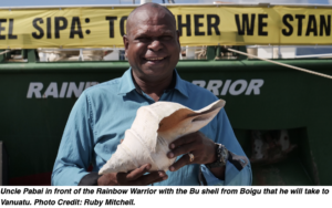 Since the end of the hearings in the Torres Strait, Uncle Pabai and Uncle Paul have joined Greenpeace’s Rainbow Warrior on a journey to Vanuatu. There they will meet with other climate activists to build stronger relationships between Torres Strait and Pasifika peoples, both groups living on the frontline of the climate crisis. As Uncle Pabai and Uncle Paul say, ‘Mura Kalmel Sipa’. Together we stand