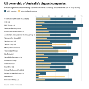 Right now US corporations eclipse everyone else in their ability to influence our politics, through their investments in Australian stocks. Using company ownership data from Bloomberg, I analysed the ownership of Australia’s 20 biggest companies a few days after the 2019 federal election in May. Of those 20, 15 were majority-owned by US-based investors. Three more were at least 25% US-owned.