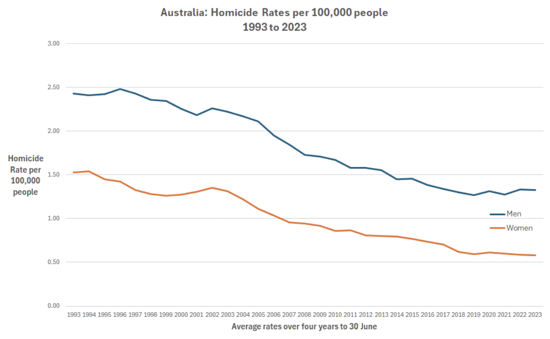 Over the last 30 years, homicide rates have halved in Australia. The rate per 100,000 men has fallen from 2.4 in the early 1990s to 1.3 in the early 2020s. It has always been the case that fewer women die in homicides than men, and the gap has been widening. For women, the rate per 100,000 has fallen faster than for men, from 1.5 in the early 1990s to 0.6 in the early 2020s. The numbers dying in domestic violence have mirrored the general trend for women. As the AIC report notes (p10) “The female intimate partner homicide rate decreased overall by two-thirds (66%) in the 34-year period between 1989–90 and 2022–23”.