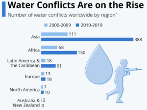The incidence of water being the cause of a conflict or being used as a weapon during a conflict increased markedly during 2010-19 compared with 2000-09. As the bar chart below demonstrates, conflicts in Asia increased more than three-fold between the two decades. Only last year, approximately 40 people died and buildings were destroyed in a one-day border conflict between Tajikistan and Krygyzstan sparked by the installation of a camera over a water source in the former. Although the number of conflicts is lower in Africa and Latin America, both regions also experienced significant increases in the number of water-related conflicts. Ethiopian plans to dam the Blue Nile are not surprisingly causing concern in Egypt.