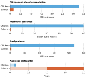 Researchers have examined four types of environmental damage done by chicken and salmon farms around the world: greenhouse gas emissions, water use, habitat disturbance and nutrient pollution from fertilisers and animal waste. Compared with salmon farms, chicken farms cause ten times more habitat disturbance, produce more greenhouse gases and more nitrogen and phosphorous pollution and consume much more freshwater, but they produce 55 times more product, partly because the ‘harvesting’ occurs in 6-8 weeks for chickens but 1-2 years for salmon (see figure below).