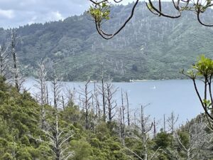 The picture below demonstrates one of the less attractive aspects of the area (I mean that ecologically rather than visually). The many dead trees you can see in the foreground and on the far hillside are the remains of ‘wilding’ (i.e. self-seeded) pine trees that have ‘escaped’ from the numerous plantations in the area and destroy the natural vegetation. Fortunately, the Marlborough Sounds Restoration Trust has for many years now been systematically poisoning them one by one. Their achievement has already been massive (I could have taken countless pictures like this) but despite the enormity of the problem and enormousness of the task that remains they are determined to see it through.