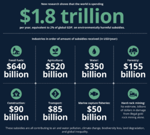Environmentally Harmful Subsidies (EHS) are defined as government programs that encourage unsustainable production or consumption, and harm nature by exhausting natural resources, degrading global ecosystems and damaging planetary health. They take many forms: cash payments, credit, liability caps, tax breaks, regulatory exemptions or the provision of good or services at favourable prices. It doesn’t take any great mind to work out what reforms are needed: greater transparency and the disclosure of all subsidies; redirecting harmful subsidies to supporting social needs and local livelihoods, protecting nature and ecological restoration; and a rapid transition that provides justice and equity to affected communities.
