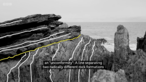 a junction between two radically different rock formations where tens of millions of years had passed without leaving any rock record. The yellow line in the picture below (‘Hutton’s Unconformity’) marks the junction between the lower rocks that formed around 430 million years ago and the upper ones that weren’t laid down until about 370 million years ago.