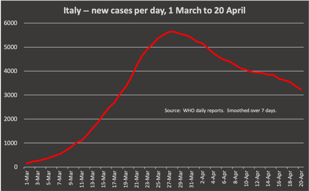When prompted by the above test we remember what we learned about compound growth. We’re probably less familiar with the phenomenon of compound decline, but that’s roughly what’s been happening in Italy since late March, and in other countries getting on top of the virus.