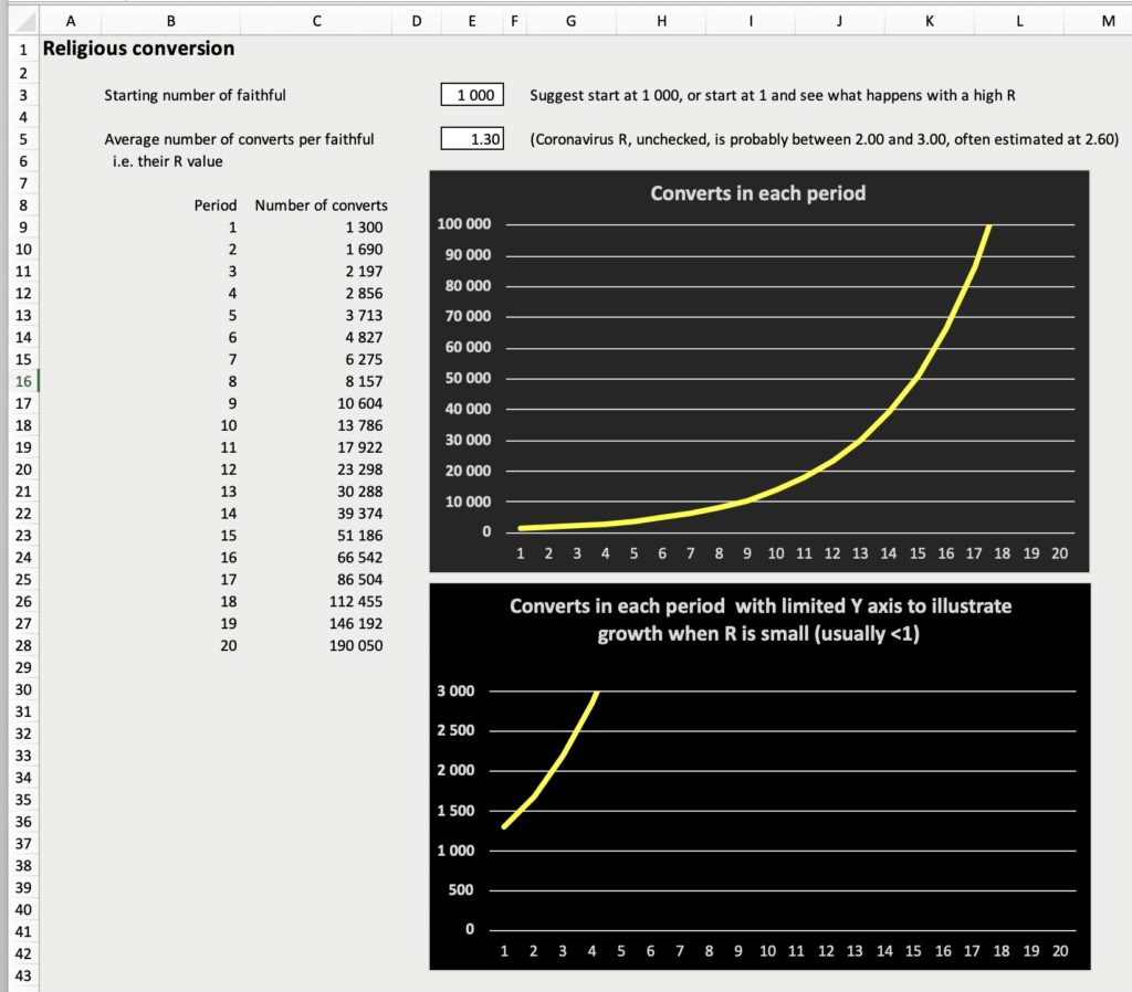 Below is a picture of what you will see when you open it. There are two cells you can change – the starting number of faithful and the R value.* I have provided two graphs, showing the same series but with different scales, because a low R value hardly shows up on the top graph, while a high R value rapidly disappears from the lower graph.
