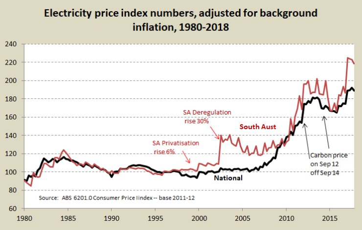 But as can be seen on the graph, SA’s price rises were much earlier, following privatisation and deregulation, a set of national moves that saw old vertically-integrated state-owned electricity systems broken up and either privatized or corporatised, under the dogma of “structural separation”, which was the centrepiece of the National Electricity Market. (The effect in other states was just as strong but over a longer period.) Structural separation meant that the utilities were broken into their components: