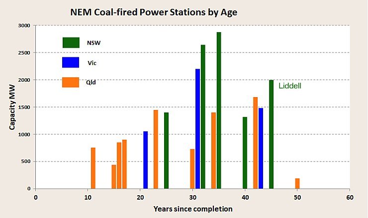 As can be seen from the graph above, Australia has a big chunk of coal-fired stations between 40 and 50 years old (including Liddell), and another big chunk in their thirties, and these old stations are not the most reliable. Whatever happens to the NEG on Friday, Australia is probably in for one or two summers where there could be interruptions to power supplies, particularly during peak periods. But if there are no impediments to renewable energy such shortages should be overcome faster with incremental additions to wind and solar than with the long lead time in building large so-called “base-load” stations.