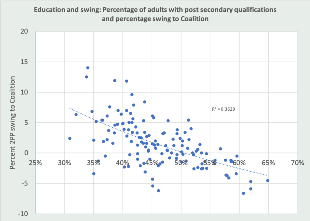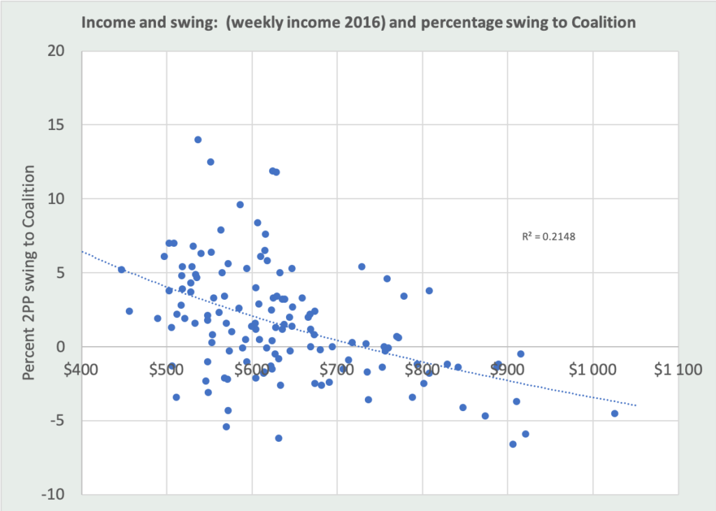 The two graphs below, based on the count as at Sunday morning, tell much of the story. The swing to the Coalition was mainly among the disadvantaged, while in seats with high incomes and a high level of education, there was a swing to Labor.