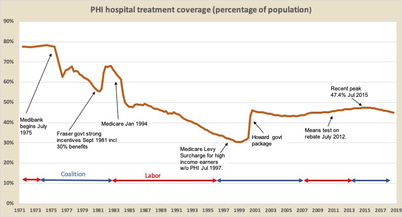 With Medibank in place, PHI coverage rapidly fell from around 80 per cent to 60 percent of the population. Then the Fraser Coalition Government, elected in 1975, restored support for PHI, and in 1981 it introduced a number of incentives virtually making PHI compulsory, thus pushing up PHI coverage up once more.