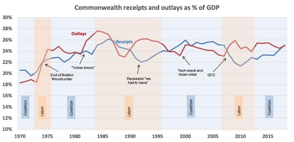 That’s how governments, Coalition and Labor, have been managing economic stabilisation for the last fifty years (and longer), as shown in the graph below. The red line shows outlays, the blue line shows receipts (mainly taxation), and the deficit or surplus is the difference between the lines.