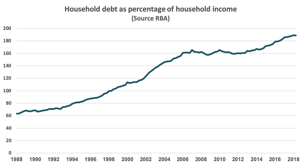 The consequences of the deficit obsession go well beyond its use in the Coalition’s anti-Labor armoury. It has also meant that while public sector debt has been kept in check, private sector debt, particularly household debt, has accumulated. The graph below shows how household debt has risen over the last thirty years: Australians held back for a couple of years following the GFC, but as wages stagnated and as households had to dig into their own finances to compensate for cuts in government expenditure, household debt climbed once more, and is now being encouraged by low interest rates and by the government spruiking the real-estate market.