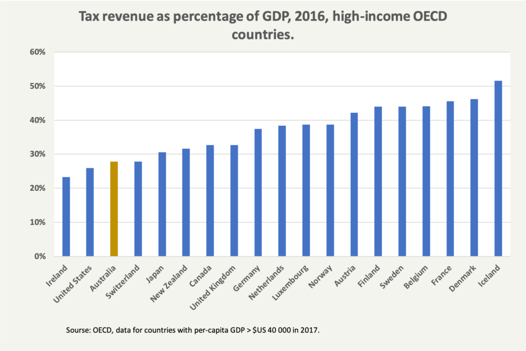 Such has been the propaganda about our “tax burden” and the desirability of tax cuts that only about 5 per cent of respondents to the Per Capita Survey correctly identify Australia as a “low-taxing, small-government country”. Among prosperous “developed countries”, only two countries have lower taxes. Australia’s rank, down near the bottom, is shown in the graph below.