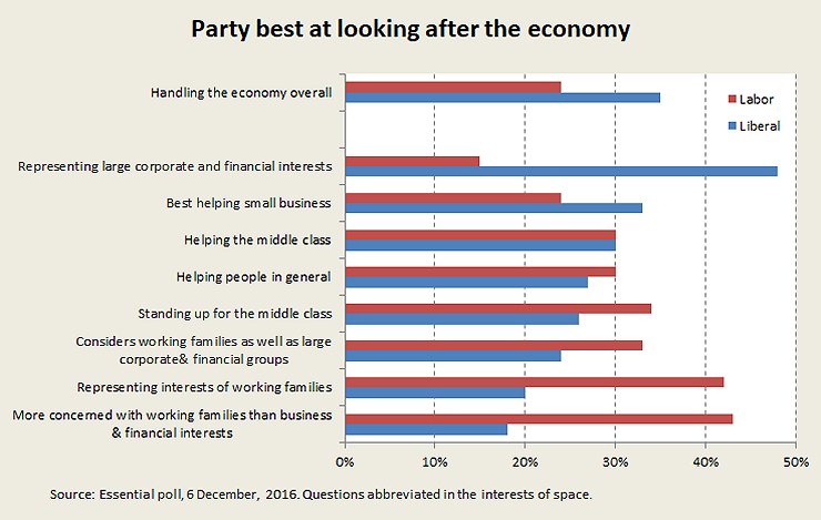 Australians clearly believe that in the economic domain the Liberal Party is more competent than Labor. But the poll also reveals what people consider economic management to mean. The Liberal Party’s supposed competence rests on its capacity to look after the interests of “business”, large and small, as if “businesses” are incarnate entities that have some interest apart from and superior to those of their stakeholders. Labor’s supposed competence is about looking after people – “working families” in particular.