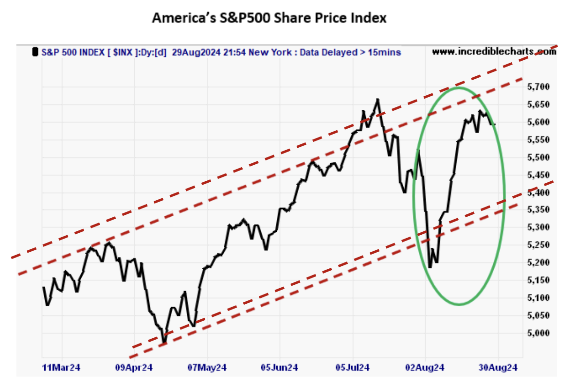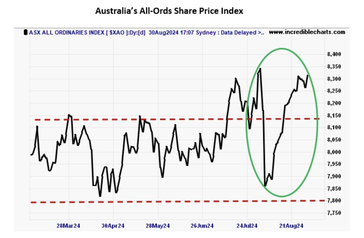 Unlike America, Australia’s stock market during most of last year swung sideways because it has few tech stocks promising new riches through AI (artificial intelligence). However, the All-Ords, like the S&P 500, enjoyed a strong rally between October 2023 and March 2024 but then swung sideways until 11 July when it jumped its previous trading range, though it plunged back into it in August before sharply recovering.