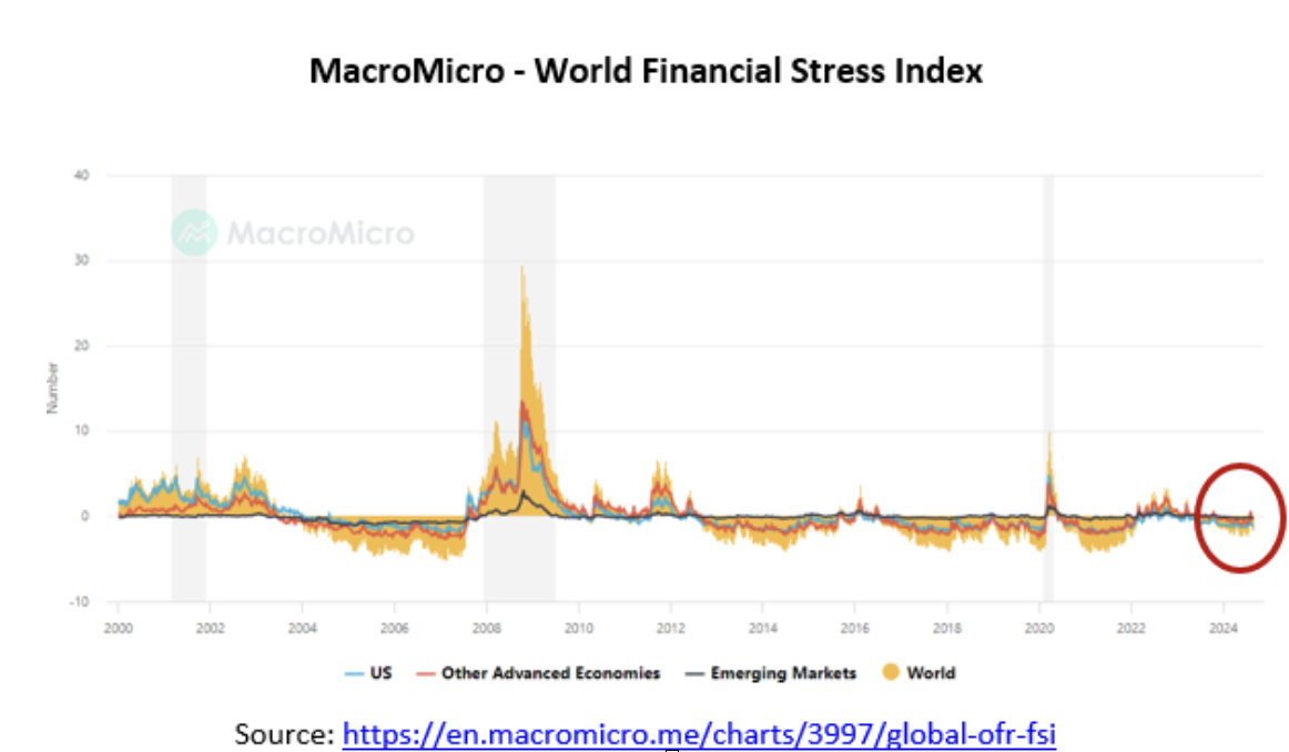 3. Global financial stress after bouncing above zero is now below it. That is positive for global stock markets. See next chart.