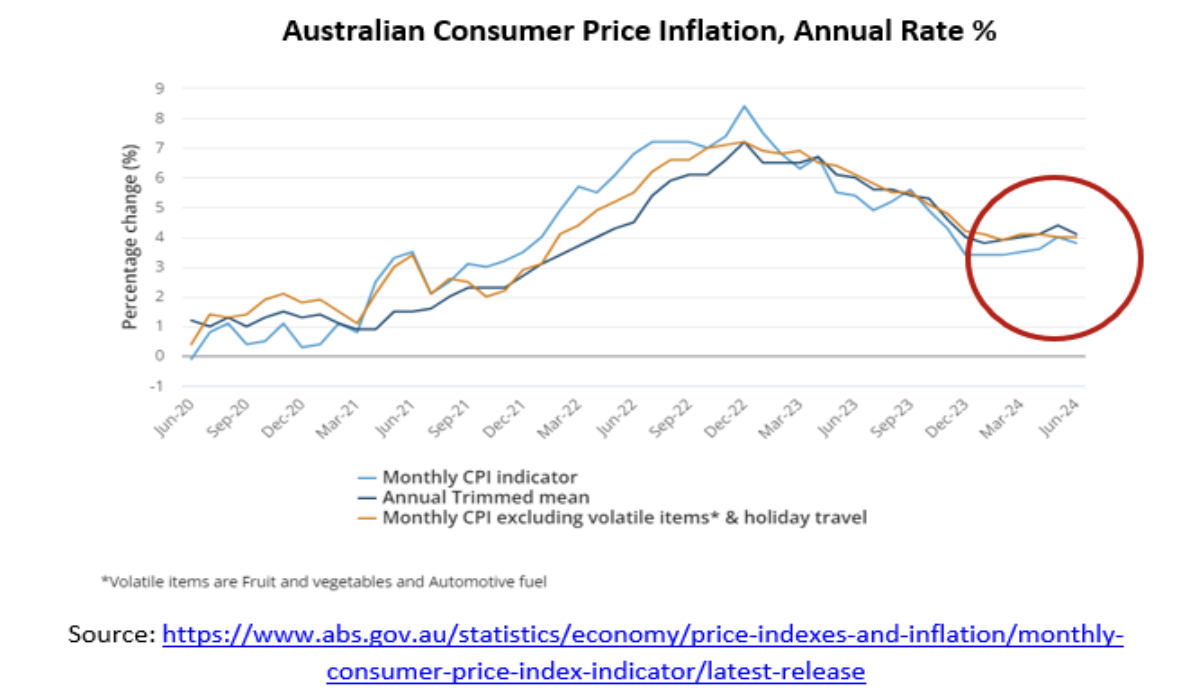 4. Australian annual consumer price inflation after rebounding since last December, is trending down again according to the latest June quarter data. This persuaded the RBA to keep its cash rate on hold, though it says it may need to do so well into 2025 because inflation remains sticky.