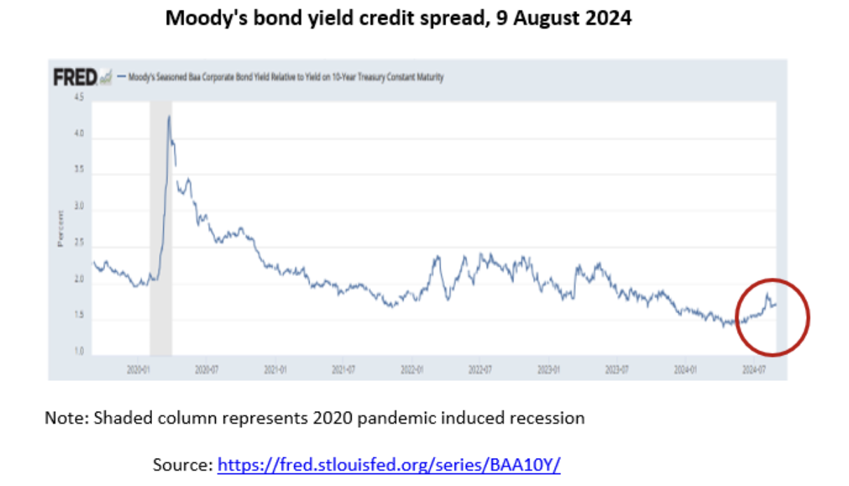7. Moody’s bond yield credit spread is still at a near historic low meaning investors see minor risk between investing in a 10-year treasury bond and a low credit rated investment bond. That suggests few worries about a credit squeeze. Bond yield credit spreads are also low in Australia, see https://www.rba.gov.au/chart-pack/interest-rates.html However, credit spreads have been gradually creeping up since May, which needs close watching.