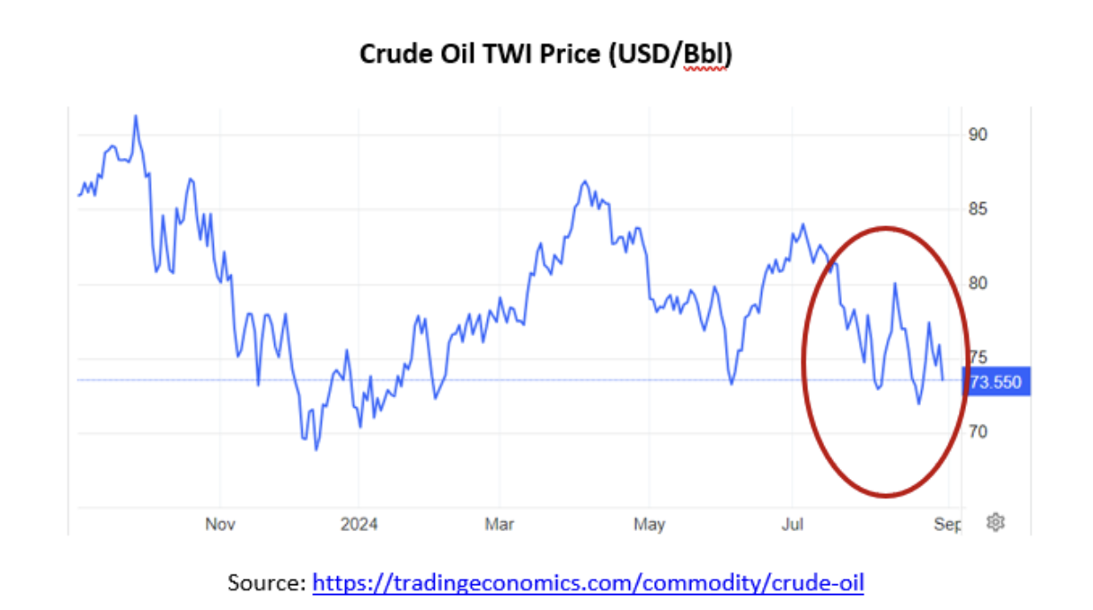 9. Oil price is falling which is welcome since it lowers consumer price inflation and improves the prospects of interest rate cuts.