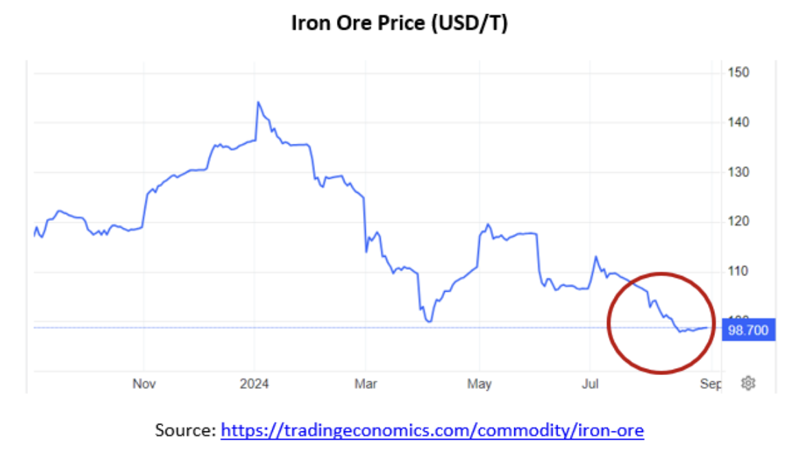 10. Iron ore price has slipped and is now below US$100. Iron ore is important to Australia because mining stocks comprise a large part of the All-Ords index and the Australian government’s income tax revenue.