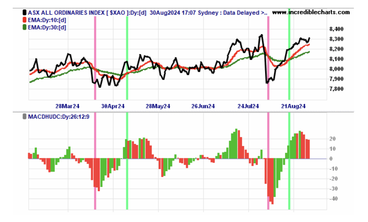 Short-to-medium-term trend analysis shows the All-Ords index went bearish on 6 August when its red 10-day trend line plunging below its green 30-day one. It then went bullish again on the 19 August and has remained so. The All-Ords price momentum, as measured by the MACD, has been positive for the past 11 trading days. See Chart below.