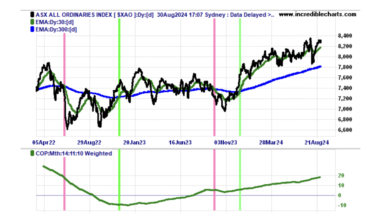 In the past whenever the Coppock turned up in negative territory it signalled the end of an Australian bear market. Only end of month readings are meaningful since the Coppock is a monthly based index.