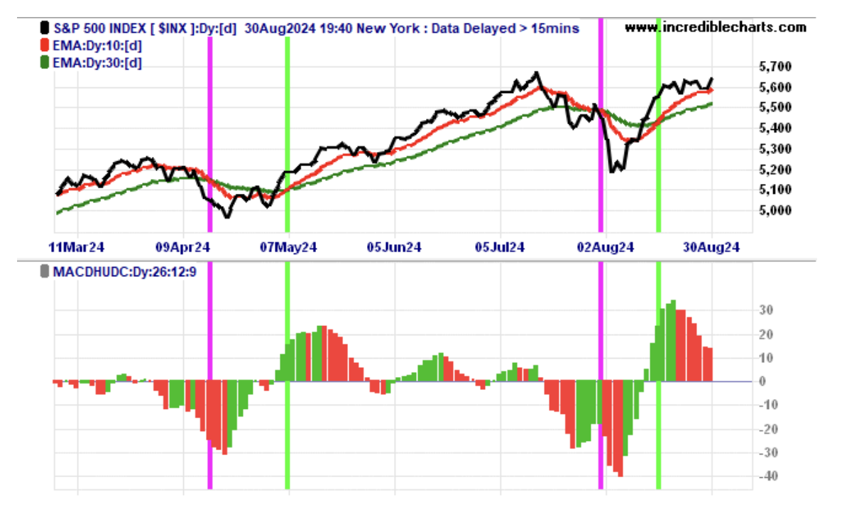 Its MACD momentum indicator has been positive for the past thirteen trading days, reflecting the recovery in the S&P500 since it troughed on 5 August.