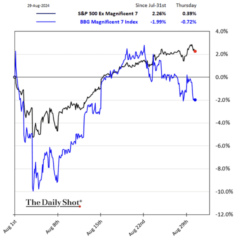 But poor earnings results by Tesla and Alphabet turned investors from a “risk on” to a “risk off” mood on big-cap tech stocks. August continued to be a rough month for the Magnificent -7 relative to the broader share market as shown by the chart below.