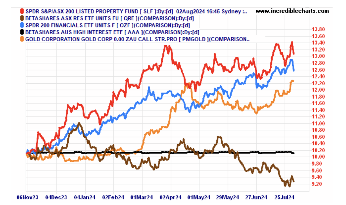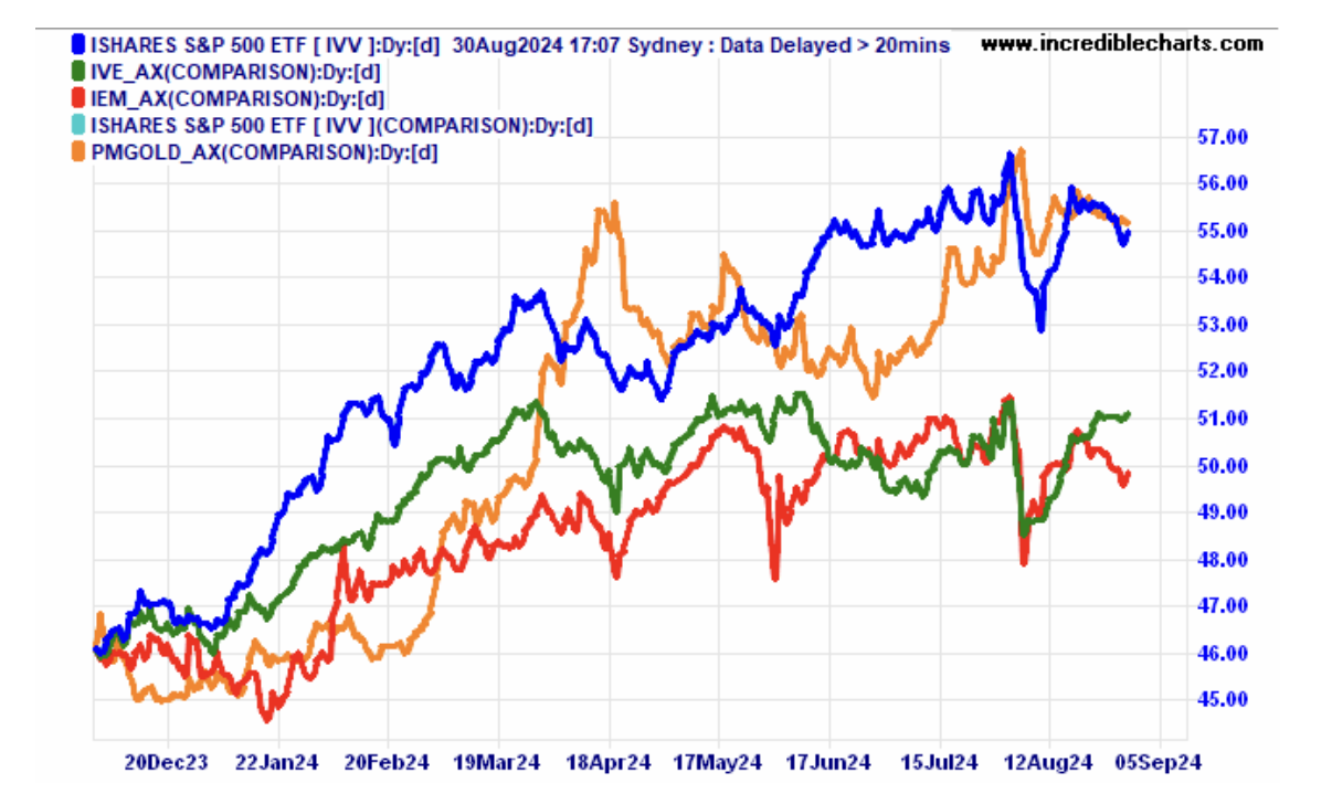 Globally, all sectors remain positive with Gold (PM GOLD.ax) slightly overtaking the US Market (IVV.ax) followed by Developed Markets outside the USA (IVE.ax) and Emerging Markets (IEM.ax) last.