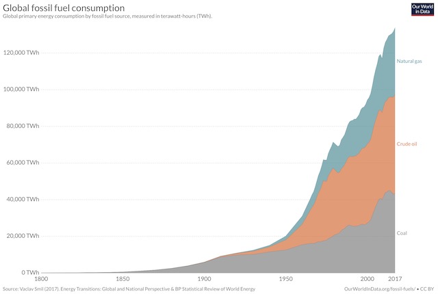 It’s obvious why we beget children – it’s what we do, otherwise, there would be none of us. What we also do, for ourselves and for our children, is utilise resources. Essentially, by using and acquiring resources, we increase our own security and improve the prospects of having and protecting our children. Here, for example, is our use of one resource, fossil-fuels, over the last 150 years). It corresponds to the population increase over the same period and is, presumably, driven by it.