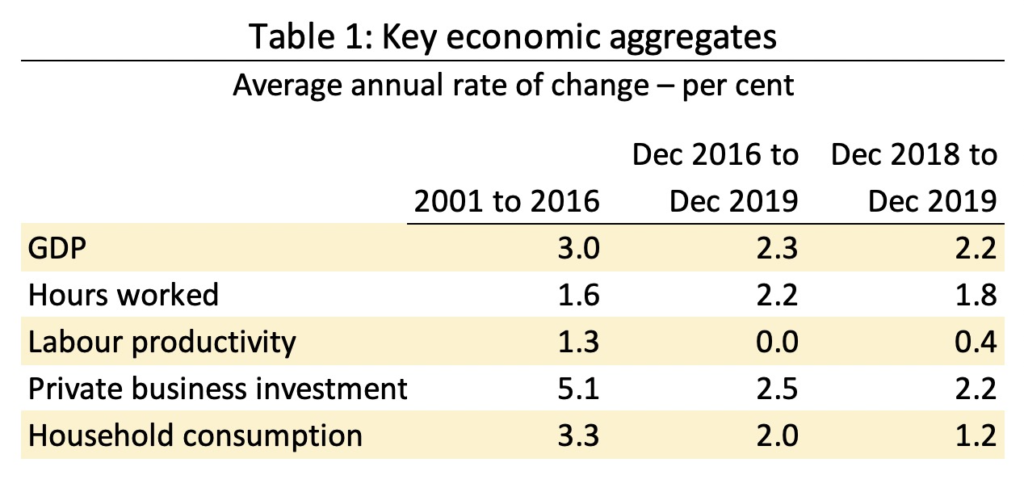 The (unadorned) reality is that in the last December quarter, real GDP grew by 0.5 per cent, and by 2.2 per cent over the course of 2019. This was a bit of an improvement on the 1.8 per cent rate of economic growth recorded over the previous 12 months ending in September, but way below the average annual rates of economic growth recorded in the past. By comparison, real GDP used to grow much faster: at an average annual rate of 3.9 per cent in the 1990s, and by 3.0 per cent from 2001 to 2016, but over the last three years economic growth has slipped and only averaged an annual rate of 2.3 per cent (Table 1).