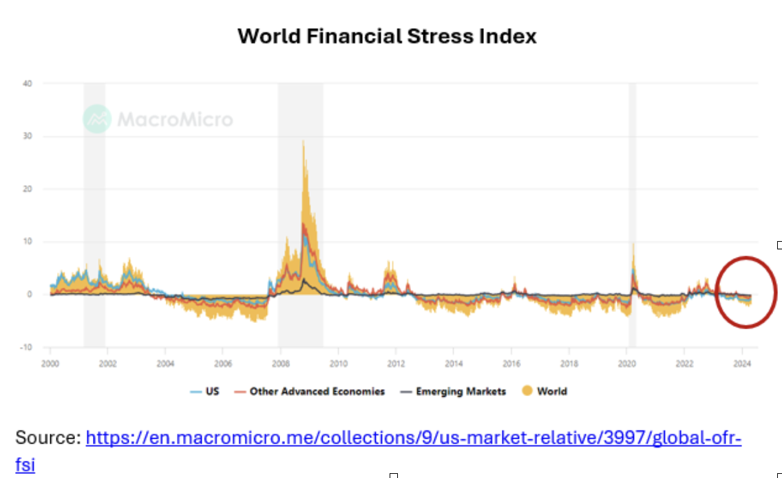 Source: The Patient Investor In addition, global financial stress is absent suggesting no imminent credit squeeze. See following chart.