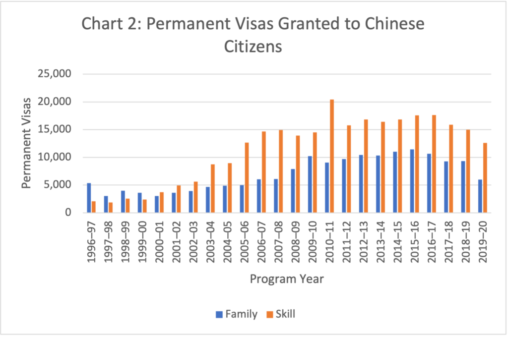 There will likely be a small rise in family and business visas granted to Chinese citizens in 2020-21 predominantly due to backlog clearance. But the long-term trend will be decline even after international borders reopen and even if the Government increases the migration program as assumed by the Treasury Department in its December 2020 Population Statement. The tightening of the business skills program and increased use of the new Global Talent Independent for business migrants and investors, where decision-makers have much more discretion in who they approve, will lead to a decline in visas granted to migrants from mainland China. That will be partly offset by increased grants to migrants from Hong Kong.