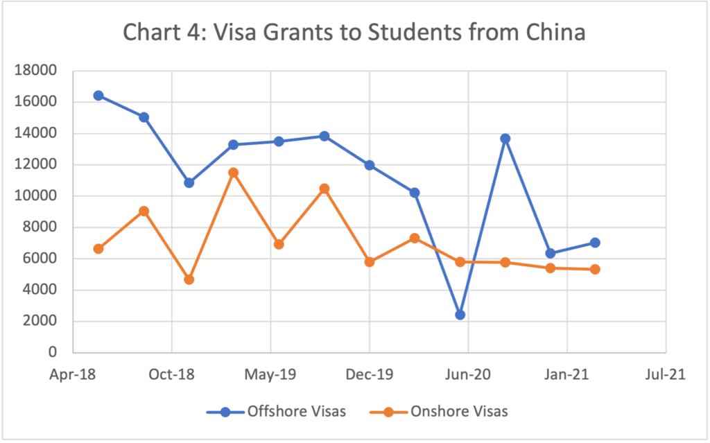 Offshore student visa grants to Chinese students are unlikely to return to 2018 levels. Onshore visa grants to Chinese students have also declined due to the decline in the stock of Chinese students in Australia although there will be some onshore student visa applications in the very large bridging visa backlog.