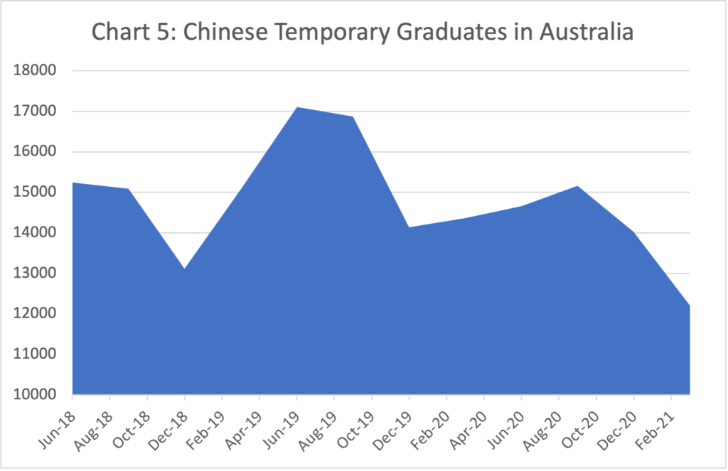 However, the number of Chinese temporary graduates in Australia fell in the last two quarters to March 2021. Temporary graduate numbers generally rise in the March quarter of each year but fell in the March quarter of 2021. This may partly be due to slow visa processing by Department of Home Affairs but is more likely the result of the steady decline in Chinese overseas students in Australia. This trend is likely to continue whist Australia-China relations remain paralysed.