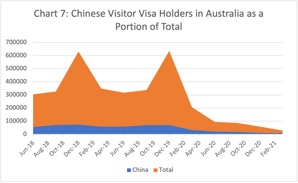The number of visitor visa holders from China in Australia has declined with covid-19 (see Chart 7). There must be real doubts whether visitor numbers from China will return to pre-covid levels once international border reopen given the deterioration in the Australia-China relationship.