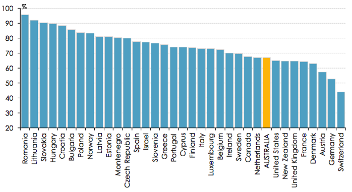 Even the broad numbers show that our rate of home ownership is not particularly high by international standards, despite the long talked about Australian dream. The following chart from the AIST report illustrates the point.