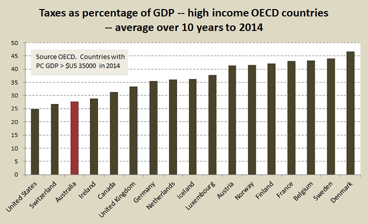We’re down there with the two lowest-taxing countries. One, the USA, has crumbling infrastructure, grossly inequitable and expensive health and university education systems, a miserable social safety net, and a budget deficit to GDP ratio twice that of Australia. The other, Switzerland, does have high-standard public goods and services, but their statistics do not necessarily record a whole set of tax-like charges set at the canton level.
